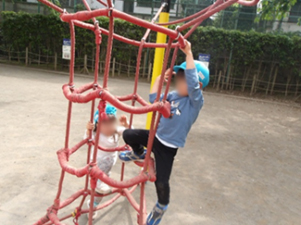 最初は砂場だけだった子も、徐々に遊具に挑戦するように。ネット遊具を軽々と登り、できることが増えるたびに自信に満ちた表情を見せています。