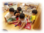 年上の子や保育士の遊ぶ姿も、子どもたちにとって大事なお手本になります。先日、年長児が開いた「ジュース屋さんごっこ」を見た子が、後日まねして遊ぶ姿もありました。