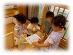2才児クラスで大事にしていることは、友達と遊ぶ楽しさをたくさん知らせ経験していくこと、とくに「みたて・つもり遊び」の面白さと大切さを感じながら子どもたちに伝えて遊びを育んでいるところです。