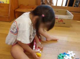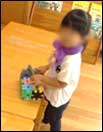 始めは「ほぼいっしょに○○つくろ~」と保母たちに声をかけ、車や、掃除機などを一緒に作っていましたが、最近では“ひとりで!”や“お友だちと!”といった姿が増えてきました。A君とB君は乗り物図鑑を見ながら「どれつくろっか~」と相談しています。いざ作るものが決まると、C君もやってきて、「これはこうしたほうがいいんじゃない?」「そうだね!」とやりとりしながら、大きなトラックが完成しました!
