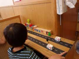これまで保育室にはデュプロと井形ブロックがありましたが、子どもたちの創造力をより引き出すため、井形ブロックを追加しました。すると、車づくりが主だった遊びが、ごっこ遊びへと広がり始めました。