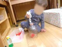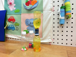 手のひら・指先も段々と上手く使えるようになってきました!ボトルにチェーンを入れたり、布絵本をしっかり押さえてマジックテープをはがしています。表情がとっても真剣です。
