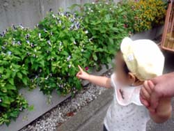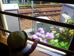 葉っぱを拾ってちぎったり、遊歩道から電車を見たり、楽しんでいます。