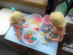 体調を見ながら、天気の良い日にはテラスで水遊びが始まりました。まだまだ緊張をして、水に触っている子もいたり、少し慣れてくると、水遊び用のシャベルで水をばしゃばしゃと叩くのを楽しんでいる子といます。