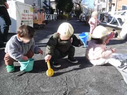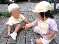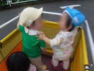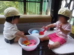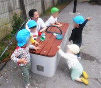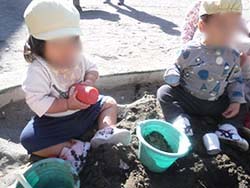お友だちや保母と手をつないで歩くことができるようになったり、砂あそび遊具を使って、ごはん作りをしたり、乳児用すべり台を楽しんだり。