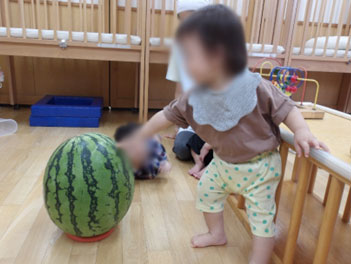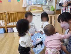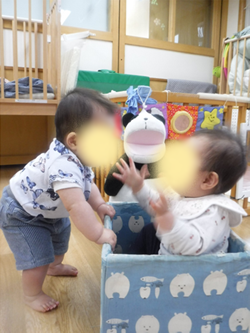 大人にあやしてもらうとニッコリ笑顔をみせてくれます。 つかまり立ちをしている子は、つたい歩きを、ずり這いをしている子は、ハイハイやお座りをしようと練習している姿が微笑ましいです。お友だちの刺激もうけて、“おなじものがほしいーー!”という気持ちも、芽生えてきているようです。