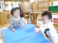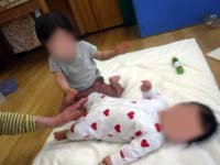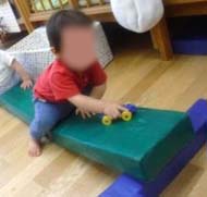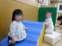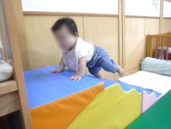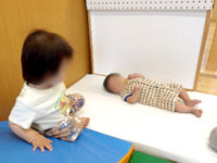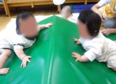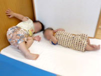 月齢の小さい子たちは、ずり這いやハイハイの練習中。小さな山に乗せてもらい、手や足指でふんばります。