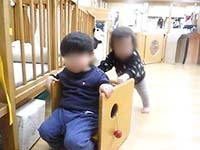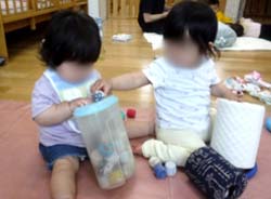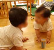 お友だちの顔をみて、お互いに笑い合ったり、くるくる回る玩具を追いかけたり、少しずつ慣れているようです。