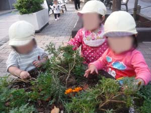葉っぱや土を触って感触を楽しんだり、お友達にプレゼントしてあげたり可愛い姿が見られます。