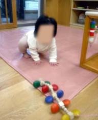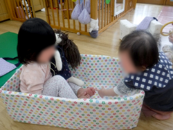 入園して一ヶ月が経ち、保育園での生活に少しずつ慣れてきた様子の子どもたち。保母から離れて音の鳴る玩具で遊んだり、はいはいやずりばいで移動したりするようになってきました。