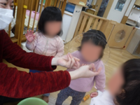 室内ではわらべ歌遊びが楽しい子どもたち。「ちょちちょちあわわ」の手遊び歌を歌うと、みんながにこにこ集まってきて手遊びする姿がとてもかわいらしいです。