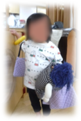 簡単なお出かけごっこが大好きになって、バックを腕にさげて、人形を抱っこしたスタイルが、ひよこ組の子ども達のお気に入りです。