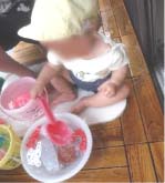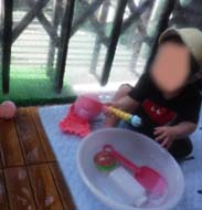 水遊びが大好きな子は、洗面器の水面を手で叩いて‶ビシャビシャ″と顔や体にたくさん水が かかりながもらダイナミックに楽しんでいます!
