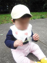 りす組(1歳児)やうさぎ組(2歳児)と一緒の散歩先でたくさん刺激を受けて過ごしています。 児童遊園では砂場遊びに夢中なことが多いですが、何やら楽しそうに盛り上がる、りす・うさぎ組の男の子達の声を聞きつけ、ハイハイで向かっていき合流。「いらっしゃいませ~」とお店屋さんを始まると仲間入りして一緒にやりとりを楽しんでいました。