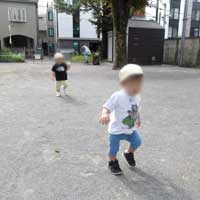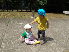 東工大にお散歩に行った時のエピソードです。いつも元気なAくんが、斜面をハイハイで進んで遊んでいたのですが、この日は少し機嫌が悪そうでした。途中で斜面が嫌になって泣き出したAくん。その姿を見て、1歳年上のBくんが近づき、「大丈夫?」と声をかけました。Aくんは泣きながらもBくんに寄り添われ、頭をなでられると徐々に元気を取り戻していきました。友情の力ですね(笑)。友だちの存在が大切に感じられる瞬間でした。