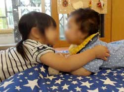 夕方になると幼児さんからおにいさんおねえさんがひよこぐみに遊びに来ることがあります「ひよこ組さんかわいい!」という声や「ひよこ組のとき、わたしここのベッドで寝てたよね?」とひよこ時代を思い出している声もあります。幼児にお姉ちゃんがいる子は来ると嬉しそうに甘えています。他の子と遊んでいると、「私と遊んでよ!」と嫉妬している姿も…。そんな姿も可愛いですね。