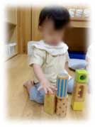 また積み木を積んでいく事やポットン落としに夢中で倒れても何度かやってみる姿や容器の中がいっぱいになるまで入れる集中力にも驚き成長を感じています!