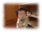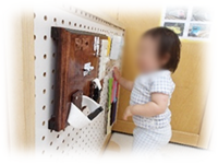 保育者が「ブーン」と走らせてみると、その子も一緒に「ぶー」と音もつけながら走らせていきました。女の子は壁面ボードのおもちゃに夢中!スイッチやマジックテープのおもちゃがあり指先に集中してくりかえし挑戦!そして、おままごとコーナーではモグモグと食べるまねっこや、まぜたりすくったり!『自分で出来るよ~』の満面の笑みで保育者にご馳走をしてくれるのでした。