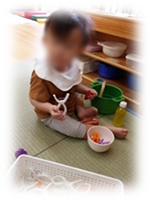0歳児保育で特に大事にしている一つに食事があります。授乳もその子にあった乳首を親と検討し、離乳食も、準備食・初期食・中期食・後期食があり、スプーンだけでも4種類用意されています。きめ細かな食事を無理なく勧めていくことが大事だと考えているからです。