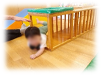 その頃ひよこ組のお部屋では…広いお部屋の中をずりばいやハイハイ、伝い歩きをしながら散策を楽しんでいる子どもたち!自分のペースで゛やってみたいな゛に挑戦!ウレタン山の反対側に保育者が「こっちにいおで~」「いち、に、いち、に」と声をかけ応援!゛よいしょよいしょ゛とお山登りに。保育者の「まてまて~」に笑顔をみせながら木製トンネルをくぐり抜けていきます。
