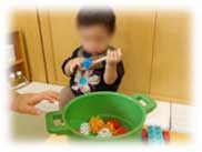 最近は小さなミニテーブルにカラーカップを出すとお料理上手、たくさん食べるひよこ組の子どもたちが集合しています。チェーンやキャップを入れて盛り付ける子もいれば、カップの中のチェーンを炒めているかのように振ってみたり、果物の縫物を持ってきてはカップに盛り付け保育者に食べさせてくれたり、お部屋だけではなく散歩先でも砂場で葉や砂を見立てて遊んでいます。それぞれの遊び方があり面白いです。またそのお友だちの遊びを見て真似してみたりと、更に遊びが広がっています。