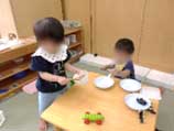 おままごとや手先を使った遊びが大好き!ままごとの水道で手をごしごしした後には、椅子に座りスプーンを使いすくって「もぐもぐ」してみては美味しい表情を見せてくれる子どもたち!お友だちにも「あーん」と食べさせてくれます。お友だちとの関わりも増えています!