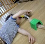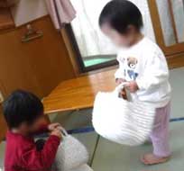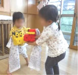 井形ブロックと布で獅子舞を作ったことをきっかけに、りす組では“ししまいブーム”が到来。「ししまい つくって~」と毎日保母にリクエスト。お尻や腰をクネクネ動かして、なりきったり、「ししまいだぞ~」と保母の頭を「かぷっ」と噛むふ りをしてくれました。