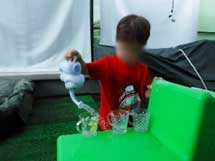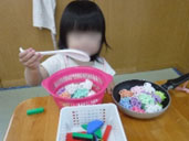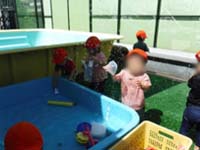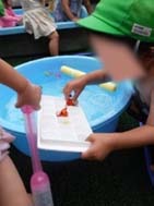 小プールで足をバタバタさせてみたり、たらいに浮かべた魚を製氷機の入れ物に一匹一匹入れてみたり玩具や容器も沢山用意してあるのでそれぞれ選んで遊んでいます。