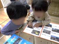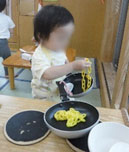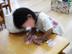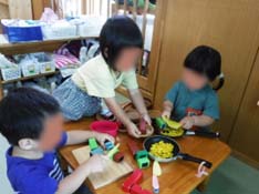 ままごとの道具もいろんなものが揃っていて、料理を“作る”という遊びがはかどります。パズルや絵本などは自分たち自身で取り出すことが出来、興味のあるパズルに挑戦!ちょっと難しいようです…