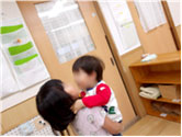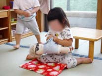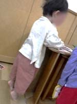 月齢の低い子たちも衣類の着脱がスムーズにできるようになってきて、やる気も満々!ズボンにはスッと足が通せるようになり、引き上げの時、お尻につかえると、「できない~」「やって~」と助けを求めてきます。靴の着脱もあっという間にやってしまい、“もうできたの?”と保母たちもびっくりするほど。意欲的な時ほど、力が伸びる時です。見守って、出来たことを認めて一緒に喜び合っています。