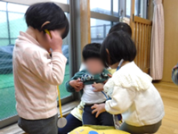 11月の初旬にクラスの模様替えをしました。それをきっかけに、子どもたちの遊びが一段と盛り上がっています。イメージの世界で遊び姿が多くみられるようになり、“お母さんになりきる”“救急隊員になる”などいわゆる『ごっこあそび』を楽しむようになってきました。
