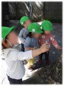 虫探しは今のりす組のブームです!木の枝を手にしながら木の幹や植え込みに向かい、持っている枝でつんつんと探します。すると芋虫を発見!保母が捕まえて、みんなに見せに行くと「コワイ!」と言いながらも、芋虫を見つけた木の所に集まっていました。