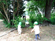 いつも散歩で行く場所とは違い、土や落ち葉、木々に斜面と魅力的な遊び場です。急な斜面を登ったり、降りたり。木の陰に隠れたり、枝を集めたりと、思う存分遊び、泥だらけになった子もいます。今後、散歩でもいけたらいいなと思いました。