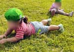 芝生の斜面を「しょっ」と頑張って歩いたり、小枝や実を見つけたりと、それぞれが思い思いに楽しんでいます。