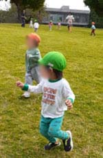 それに続いてりす組さんも走っていきます!めいっぱい体を動かせるのが気持ちよさそうです!転んでも芝生で痛くないのか、転んでもキャㇵっと笑顔で楽しそう