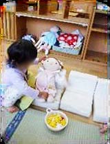 昨年6月に保護者に作って頂いた人形は、ごっこ遊びの相手になり、病院ごっこやお出かけごっこ、お昼寝ごっこなど、子ども達と一緒に遊んでいます。そして、時に子どもたちのやり場のない気持ちも受け止めてくれています。