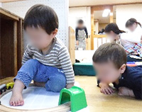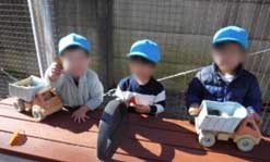 2歳を迎える子も出てきて、いわゆる『いやいや期』が始まってきているりす組の子どもたち。友だちが作ったおもちゃが使いたくなり「こうかんこ」とやりとりをしたり、友だちのおもちゃを使いたそうにしているAくんに、大人が同じものを作っても〝友だちが持っているから価値がある″というように見向きもされません。