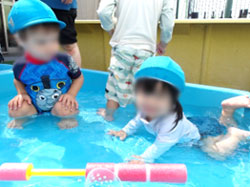 みんなプールが大好きです。お魚すくいや、水鉄砲、ぞうさんじょうろなど、それぞれ好きなオモチャで遊んだり、出来る子はワニ泳ぎのポーズを見せてくれたりします。