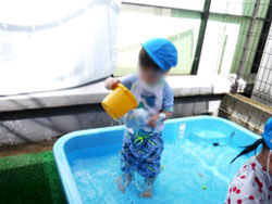 りす組は小プールとたらいで遊んでいます。水に濡れるのはへっちゃら!な子どもたちが多いりす組です。初めは緊張している子もいましたが、プールの回数を重ねるうちに慣れてきました♪