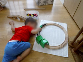 電車で遊ぶことが上手な子、その様子をじっと近くで見ている子。やがて、上手な子の遊び方をマネして、自身も電車遊びにのめり込んでいく姿が見られます。