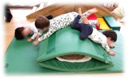 雨の日にはお部屋の中でジャングルジムや滑り台、太鼓橋を舟にしたりして、身体を動かして楽しんでいます。