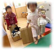簡単なごっこ遊びもできるようになり、お友だちとおでかけごっこがしたい子が、「〇〇ちゃん、あそぼ」と誘いに行っていました。ベビーカーに見立てた箱に、人形を手に取って出発です。