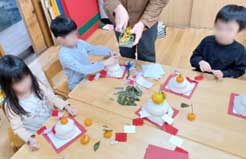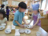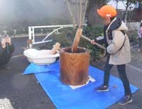 年末のもちつきでついた餅をぞう組が鏡餅を作り、各保育室や玄関に飾り、1月に鏡開きをしました。鏡餅とはなにか、子どもたちに話をしていくと子どもたちになりに受け取って考えながら取り組んでいました。