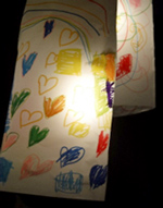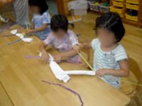 はさみを使って自分で切ることが出来るようになるとそれが楽しくて仕方なくてA君は自分ではさみで切った紙を「みてー!ズボン」と自信満々に見せてくれます。Aちゃんは自分の手を紙の上に置いてマジックペンでなぞっていました。他にも、ネックレスやカード、くるくる剣などなど楽しそうに夢中で作っています。