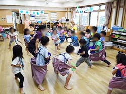 夏の暑い時期から毎日欠かさず踊ってきた荒馬踊り。かば組はギャロップ、きりん組は2つ跳び、ぞう組は4つ跳びやかもしか跳びに加え太鼓と笛のリズムに合わせて踊ります。