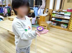 最近、男の子たちを中心にコマが大ブーム!元々、レゴブロックで作ったコマをきりんぞう組の男の子たちが友だちと声を合わせて『ゴー!シュー!』と言って回して勝負することに熱中していました。そんな子ども達の白熱ぶりをみて、保母が紐ゴマを部屋に出してみると、あっという間に紐ゴマがブームに!毎日朝からお迎えが来る夕方まで、みんなで一枚のコマ板を囲んで『ちっちーのちっ!!』と声を合わせて コマ回しに夢中の子どもたちです!友だちが楽しそうにコマを回している姿を見て羨ましくなり挑戦する子もいます。でも最初は上手に回せなくて悔し涙を流しますが、上手に回せる友だちから「左足を前に出して投げるんだよ」「指の形はこうやってコマを持つんだよ!」とアドバイスをもらって再び挑戦しています。回せるようになるとそれがどんどん自信となって夢中になって遊び込んでいますよ!