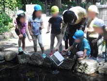 まずは何を食べるのか考えるところから。子どもたちからは「ダンゴムシとか?」「幼虫とか」と声が上がります。そこで図鑑で調べてみると生きている虫などを食べるということが分かりました。それを聞いて「逃がしてあげた方が自由になれるよ…自由に食べ物を探しにいけるよ」と言う子が。けれど虫好きの子や捕まえた子たちは「やだ!」と納得いきません。「いらない幼虫を餌にするとか?」「ツマグロヒョウモンとか?」と言う声が上がると、「え~!やだよ!」とツマグロヒョウモンを捕まえてきた子が言います。そこまでするなら逃がそうか…と大半の子は思っていましたがどうしても飼いたい子たちがゆずりません。「じゃあ生きてる虫を探す?ダンゴムシとか」「ありとかは?」という話になり、そこでもう一度図鑑を確認。保育士が「街頭に集まる虫などを食べるって書いてある」と言うと、「電気が光ってるとこ?じゃあ飛んでる虫だ」「じゃあ蚊とか蛾を探しに行く」ということで、遊歩道グループとテラスグループに分かれて飛んでいる虫を捕まえに行くことにしました。時間制限は17時まで。それまでにどのくらいの虫が必要なのか考えると「土日もあるから~(その日は金曜日でした)」「40匹ぐらい!?」「そうしよう!」と決まりました。