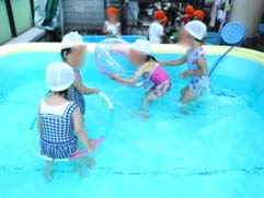 プールが始まった当初、水が怖くて嫌がっていた子も、少しずつ慣れてきて、少しくらい水がかかっても楽しめるようになってきました。昨日よりも今日、少しずつ成長を見せてくれる子どもたちです。