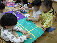 コリントゲーム作りをしました。事前に子どもたちが自分で木に絵を書いたり色を塗ったりしておいたものに、お父さんと一緒に釘を打ち付けていきます。完成したコリントゲームにビー玉を入れて転がすと、とても涼しげないい音が鳴ります。ゲームとしても、楽器としても楽しめそうです。