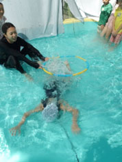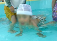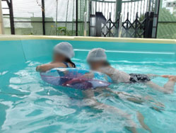次の日、「保母と一緒に泳いでみようか?」と泳ぐ保母の背中に 乗って一緒に水中へ。そこで笑顔が少しずつ見えてきました。